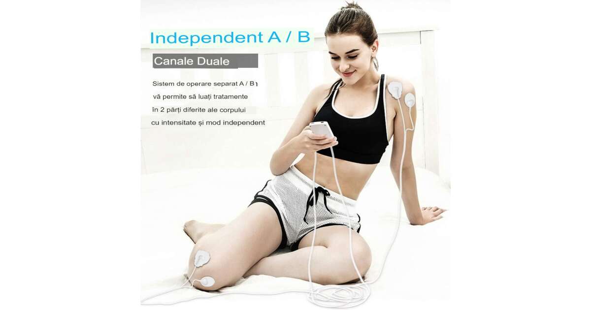 Masážny prístroj s elektrostimuláciou/fyzioterapiou MAYA MY-S044C-A, stimulátor so 16 režimami, dvojkanálový, s 20 úrovňami intenzity, 4 elektródy, dva kanály na použitie, 16 masážnych progra