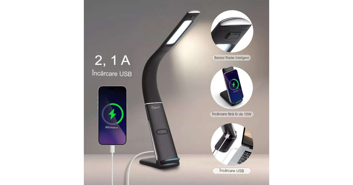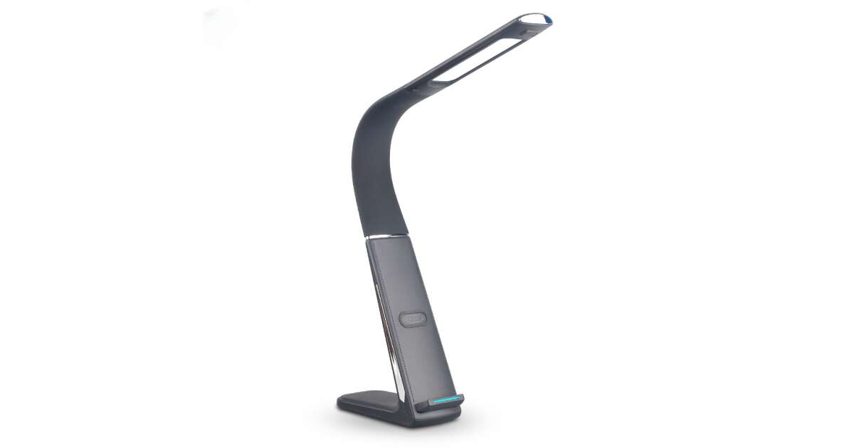 Stolná lampa s LED SML TX 75, bezdrôtové nabíjanie 10W IOS alebo Android telefónu, USB port 5V/2.1A, ochrana očí, flexibilné rameno nastaviteľné 180˚ zapaľovanie a nastavenie intenzity gestam
