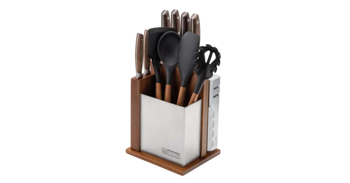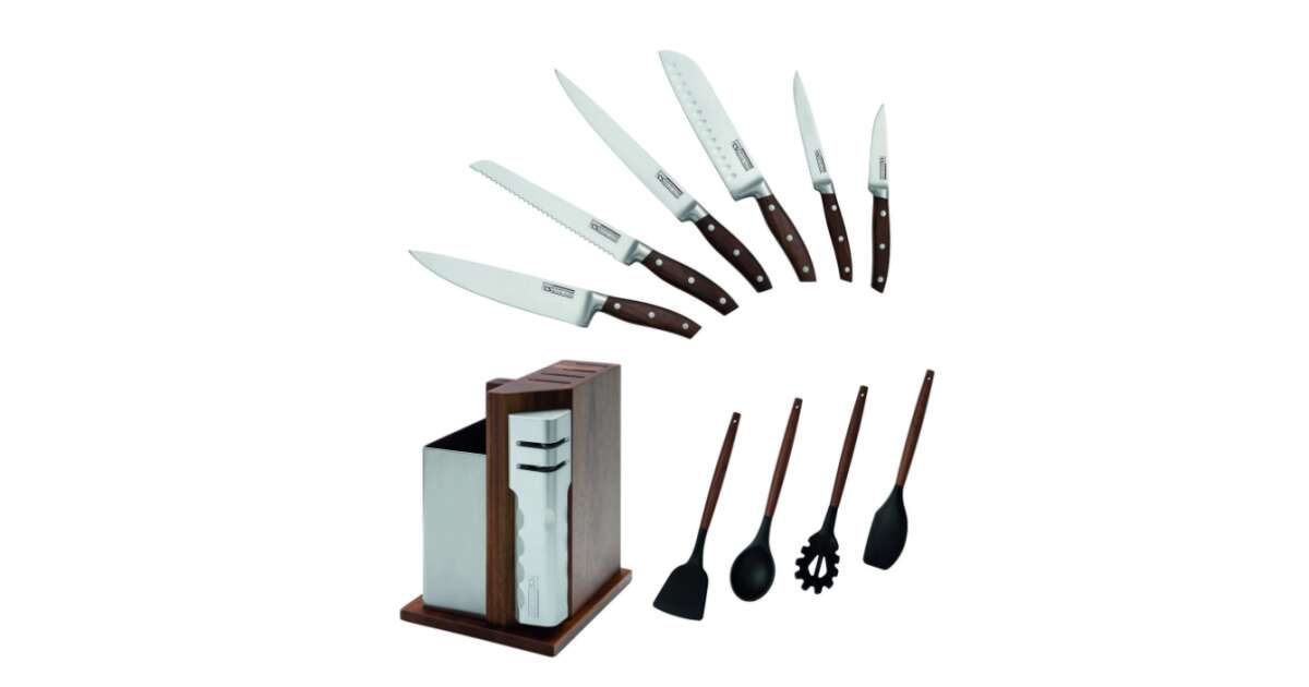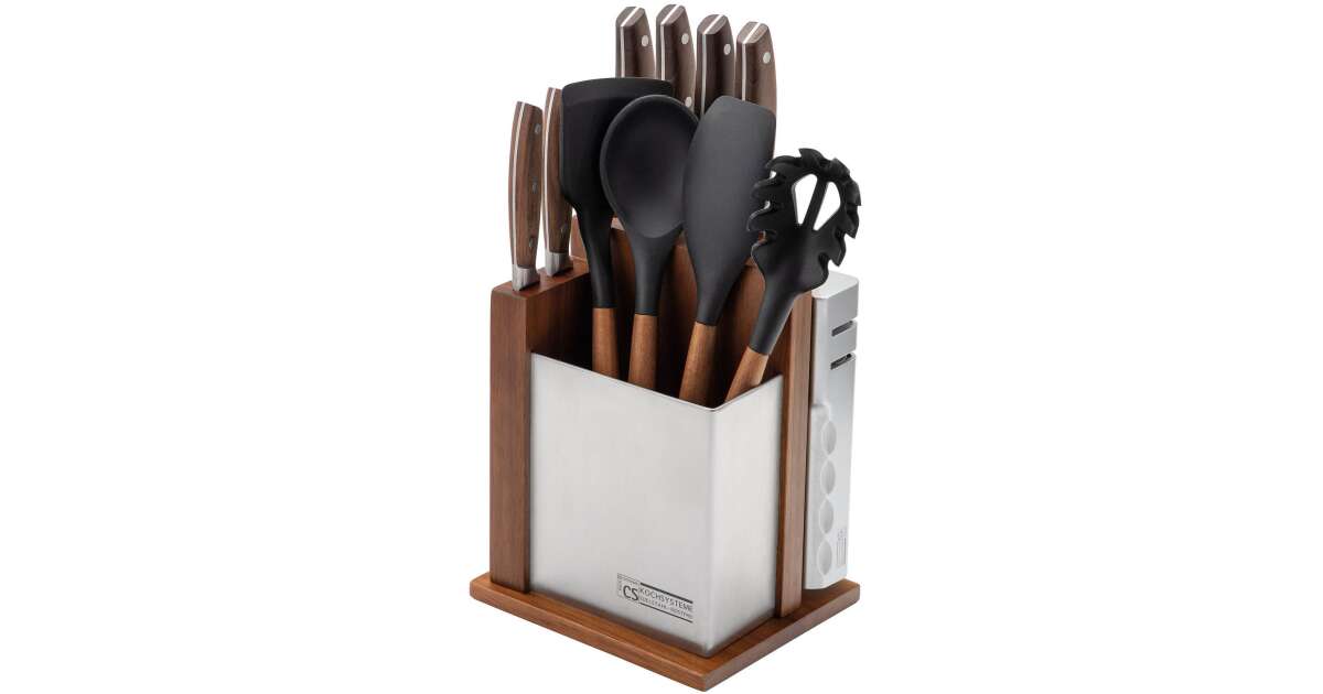 Táto 12-dielna súprava nožov Carl Schmidt Sohn Soltau obsahuje všetko, čo potrebujete v kuchyni! Prémiové nemecké nože z nehrdzavejúcej ocele s ergonomickou drevenou rukoväťou, laserom brúsené čepele a 4 praktické silikónové kuchynské nástroje v elegantnom drevenom držiaku.