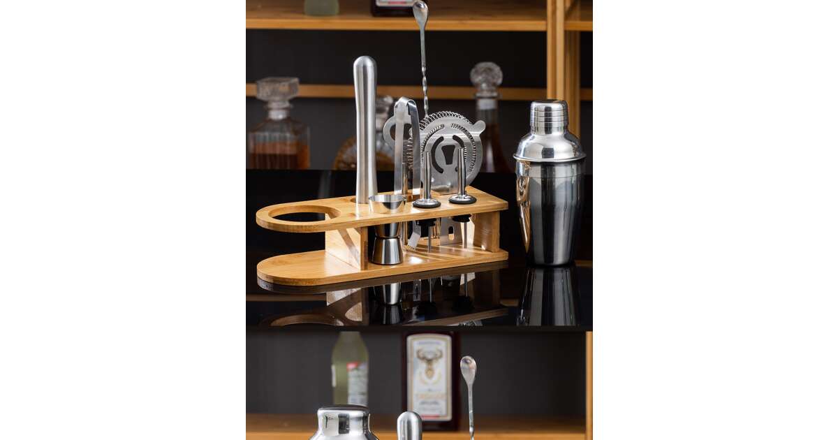Kompletná barmanská súprava Lewei MC-10, Bambusový stojan, 10 kusov, 550 ml, rozmery 17,3x13x28,5CM, Barmanská sada na prípravu nápojov, Nerez