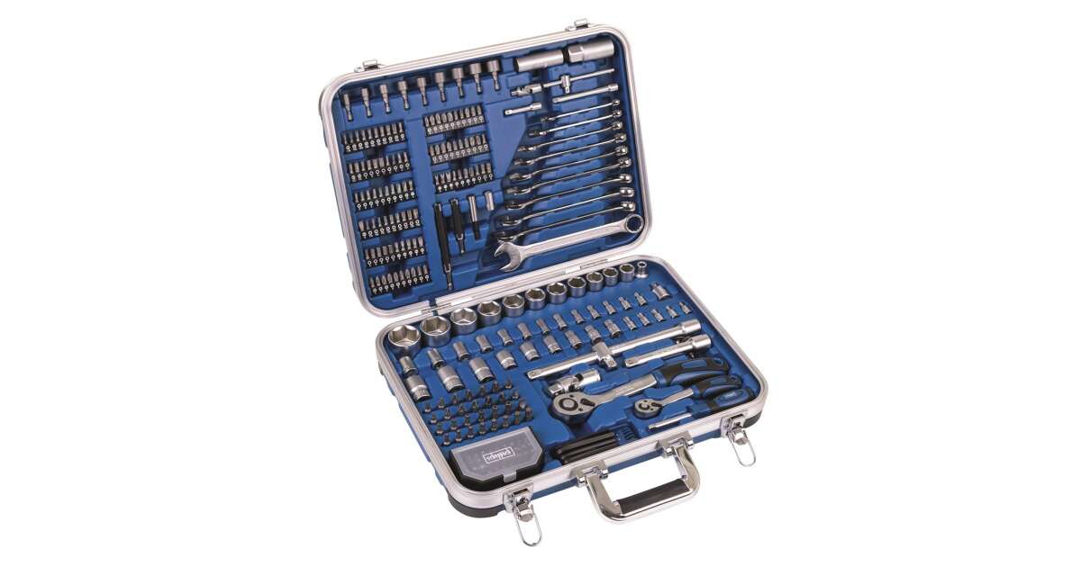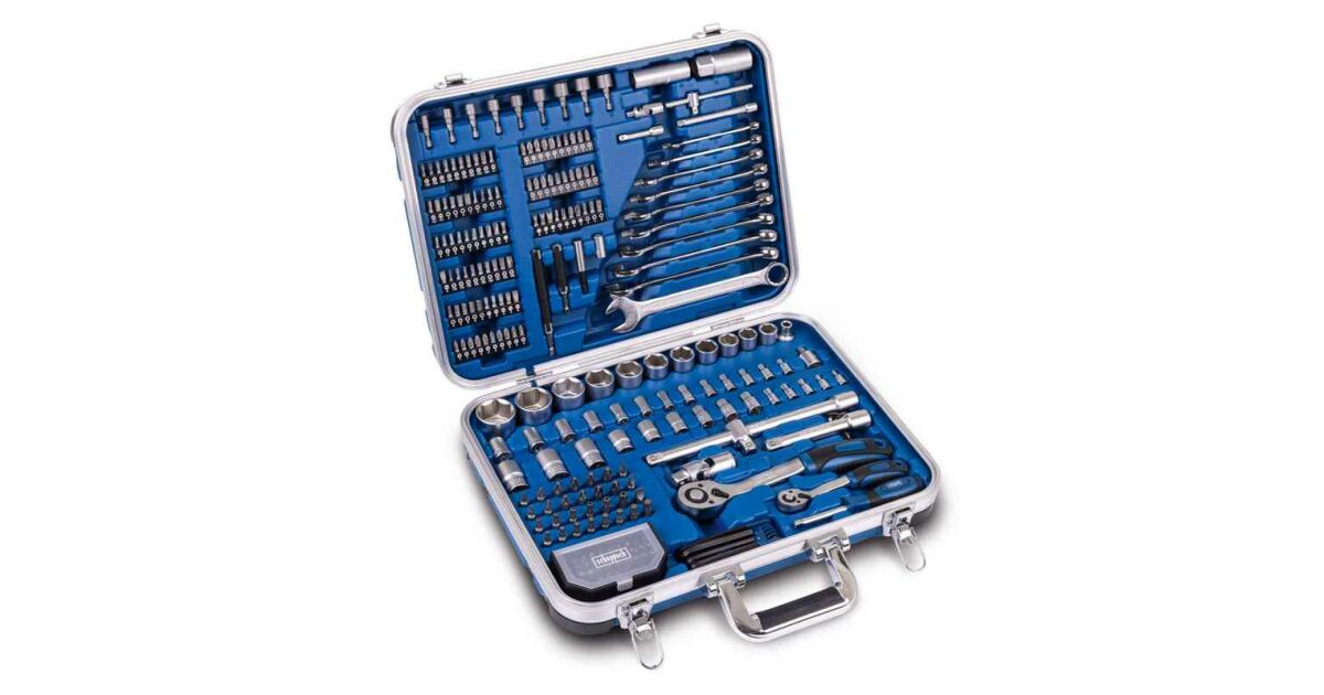 - Kompletná výbava: Sada bitov, sada kľúčov, sada nástrčných kľúčov, račňové kľúče, adaptéry – všetko po ruke na jednom mieste.