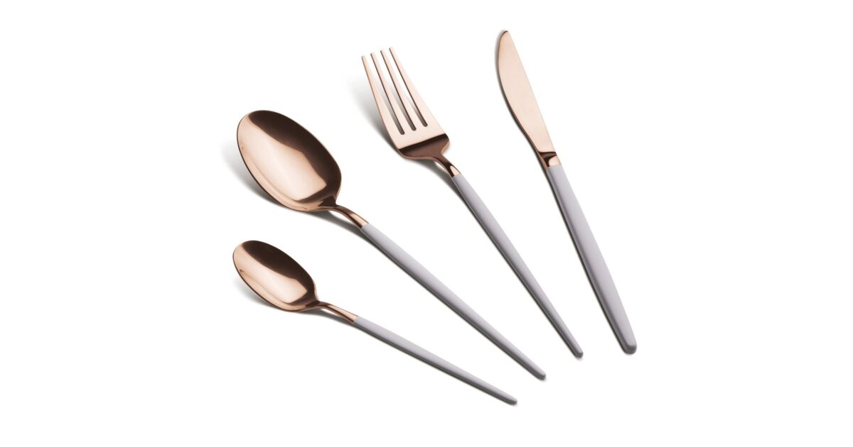 - 💪 Prémiové materiály: Vysoko kvalitná nehrdzavejúca oceľ s ružovo zlatým PVD povlakom a matnými sivými rukoväťami pre odolnosť a štýl.