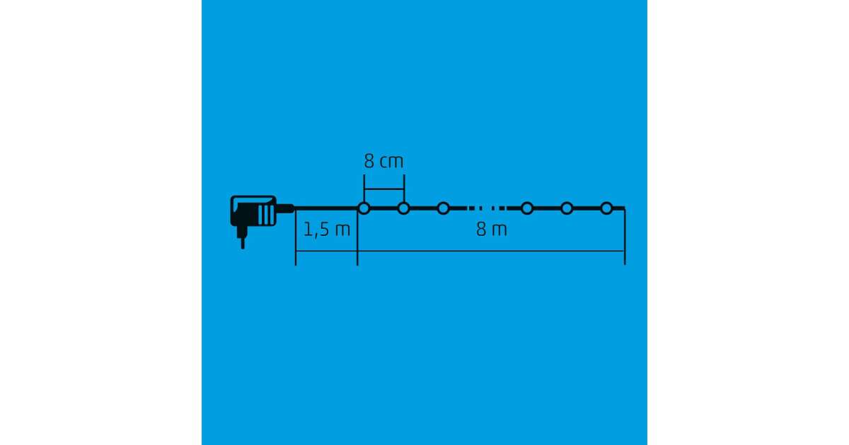 - 9,5 metra dlhý (1,5 metra kábel + 8 metrov svetelný reťaz)