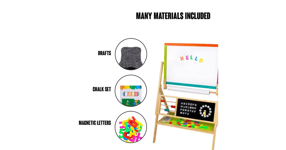 Detská drevená tabuľa, 3 v 1 stojan – čierna tabuľa, magnetická tabuľa, biela tabuľa s doplnkami popis