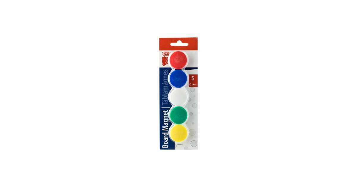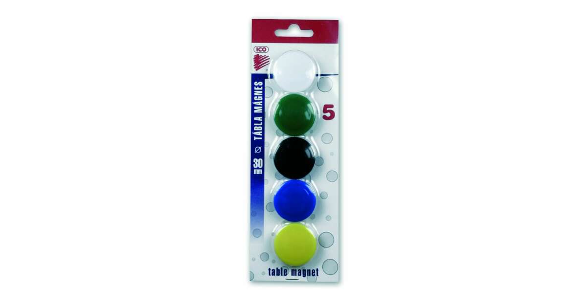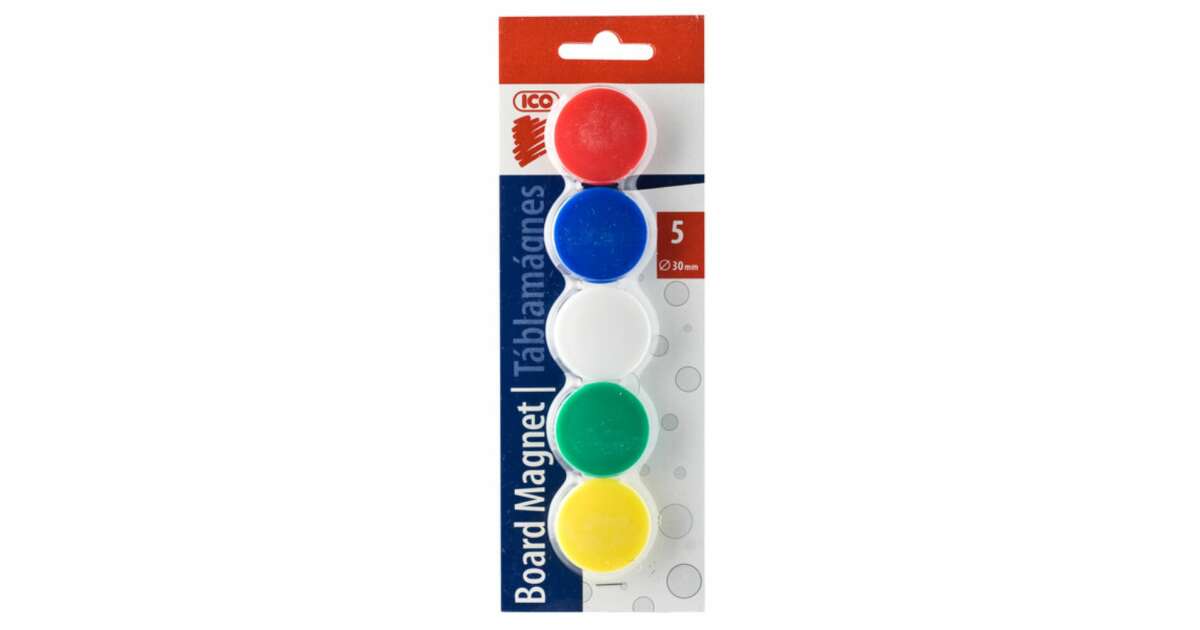 Tieto 30 mm priemeru silné ICO magnety sú ideálne pre kovové a biele tabuľe. Skvelí pomocníci do školy, na prezentácie aj do kancelárie. Dostupné v 5-dielnej farebnej sade, v blistrovom balení.
