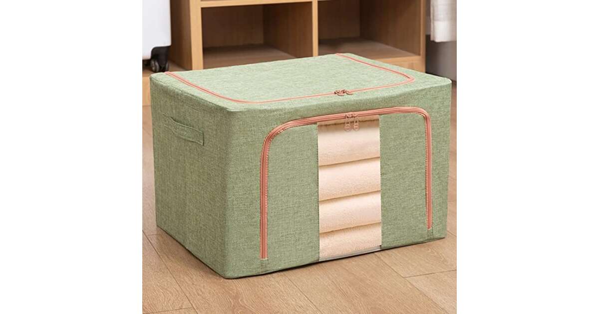Skladací úložný box, Flippy, 24 l, bavlna a ľan, 40x30x20 cm, predné okno, 2 prístupové dvierka s obojsmerným zipsom, kovový rám, stabilná plastová základňa, zelená