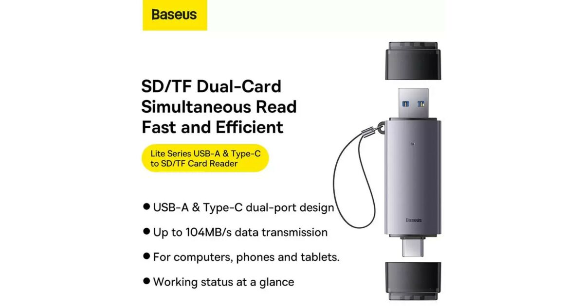 Táto čítačka kariet Baseus Lite je perfektné riešenie pre rýchle a pohodlné spracovanie súborov zo SD a TF pamäťových kariet. Má USB a USB-C konektory, takže ju môžete pripojiť k telefónu, tabletu aj počítaču.