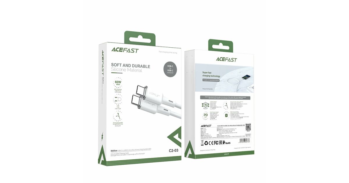 Acefast kábel USB Typ C - USB Typ C 1,2 m, 60 W (20 V/3 A) (C2-03)Kábel USB typu C - USB typu C na nabíjanie a prenos dát od Acefast. Je určený pre zariadenia s konektorom USB typu C. Je dlhý 120 cm a dokáže pracovať s prúdom 60W a 3A. Umožňuje rýchle nabíjanie v technológii Power Delivery. Dá sa použiť na napájanie notebookov s konektorom USB typu C, ktoré potrebujú až 60W energie (pozrite si špecifikáciu vášho notebooku).ŠpecifikáciaModel: C2-03Dĺžka: 1,2 mHmotnosť: 33 gbiela farbaTyp konektora: USB typu CMaximálna záťaž: 60 WMaximálny prúd: 3AŠtandardné USB: 2.0 480 MbpsRýchle nabíjanie: Dodávka energieNajdôležitejšie výhodyZáťaž až 60W. Kábel slúži na nabíjanie zariadení s výkonom až 60W.Rýchle nabíjanie Power Delivery. Umožňuje rýchle nabíjanie v technológii Power Delivery.Nabíjanie notebookov. Dáva možnosť nabíjania notebookov napájaných cez USB Type C konektor s maximálnym výkonom 60W.Optimálna dĺžka. Kábel je dlhý 120 cm a umožňuje pohodlné používanie telefónu počas nabíjania.