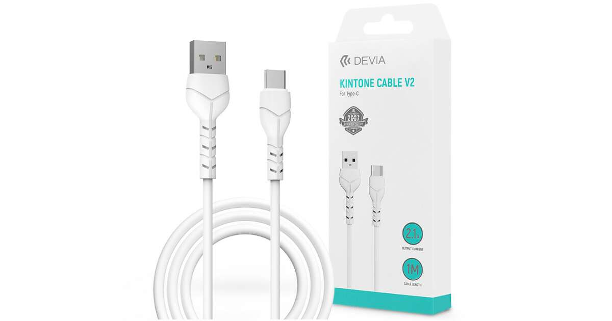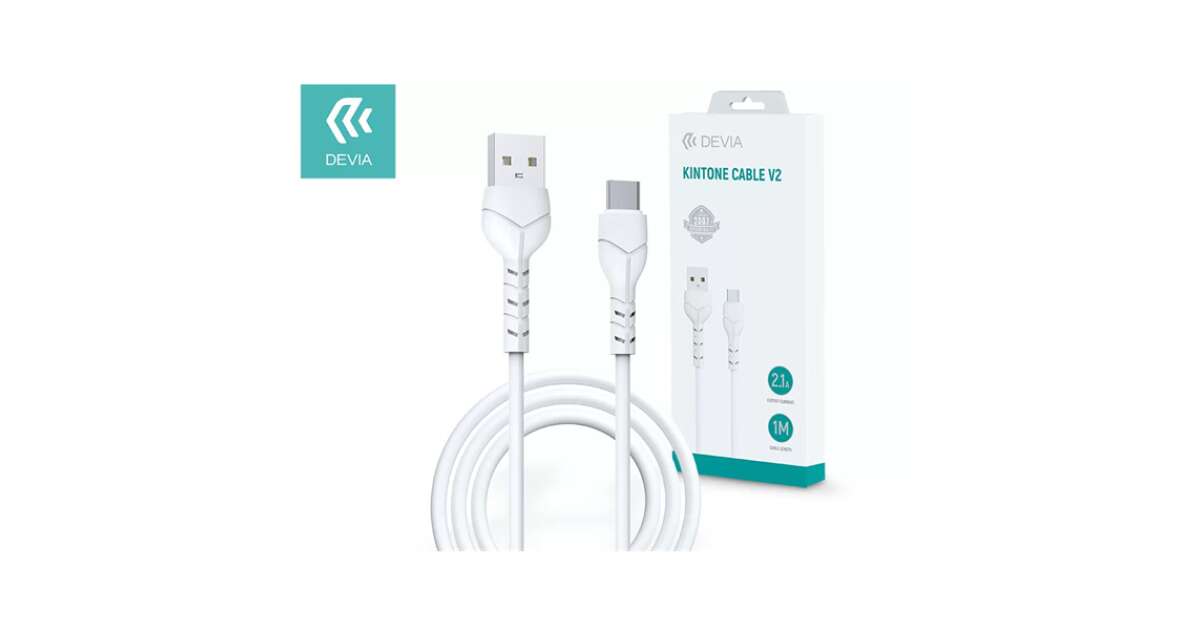 USB – Dátový a nabíjací kábel USB Type-C s káblom 1 m – Kábel Devia Kintone V2 Series pre Type-C – 5V/2,1A – biely popis