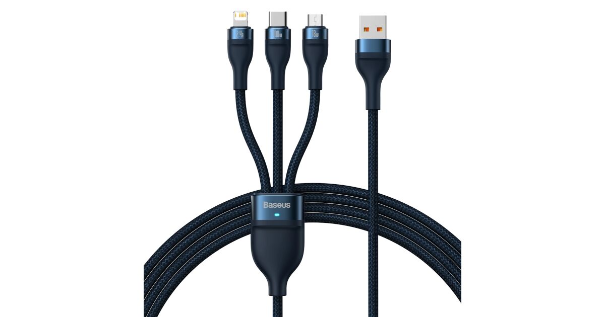 USB kábel 3v1 Baseus Flash série, USB-C + Micro-USB + Lightning, 100W, 1,2 m, modrý