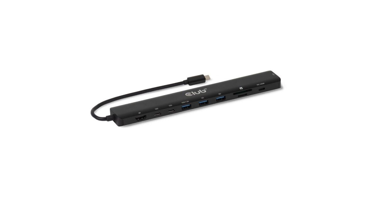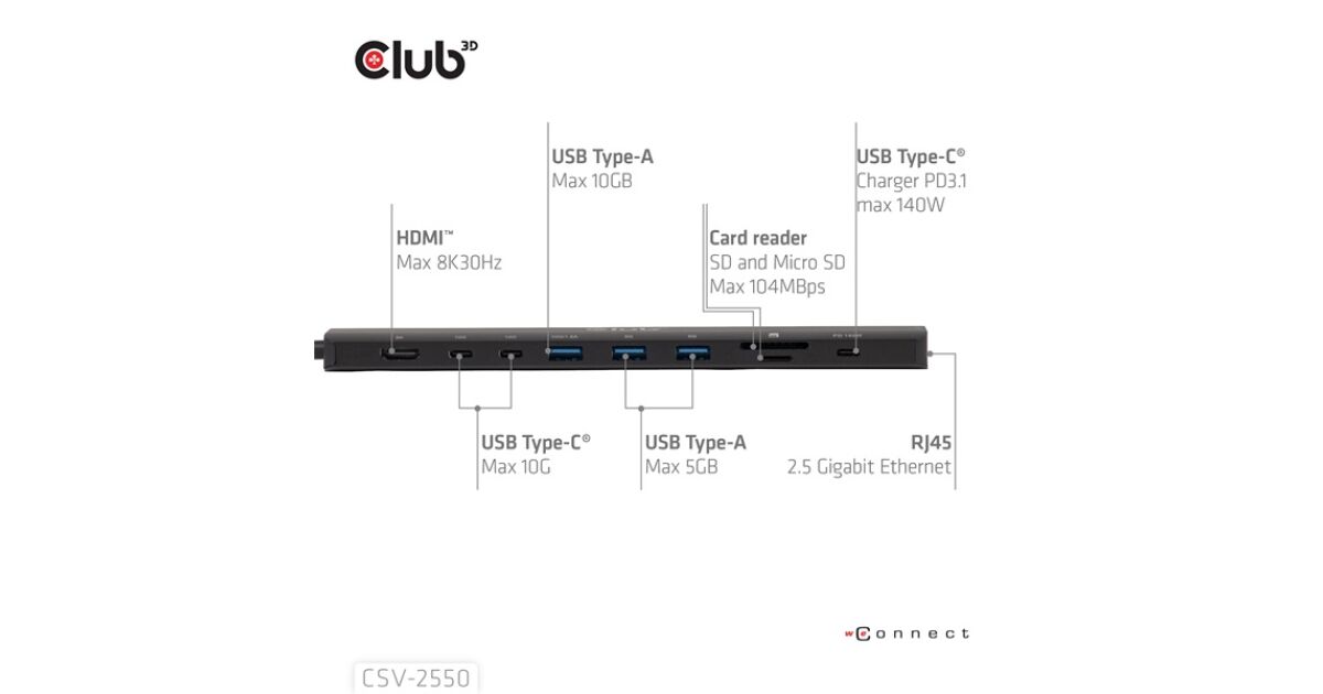 Club 3D USB Hub, CSV-2550 (USB-C na 3xUSB-C, 3xUSB-A, RJ45, SD/MicroSD, 140W PD, HDMI, 8K30hz) popis