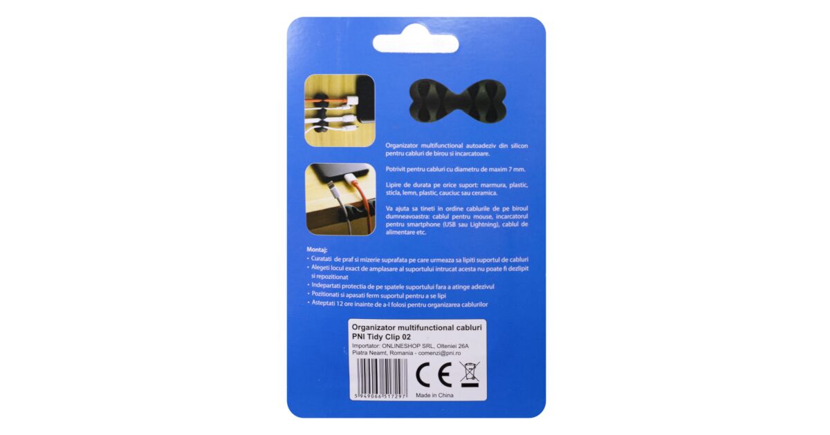 Multifunkčný organizér káblov PNI Tidy Clip 02, flexibilný silikón, samolepiaci, na 8 káblov 4x2 s priemerom 6 mm, čierny, sada 2 kusov popis