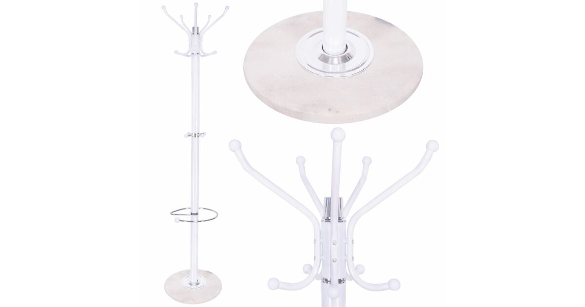 Tento 176 cm vysoký, elegantný biely stojan na oblečenie je perfektnou voľbou do predsiene, kancelárie alebo úradu. Stabilná mramorová podstava zaisťuje bezpečné státie, zatiaľ čo šikmo umiestnené, zaoblené vešiaky zabraňujú zošmyknutiu a poškodeniu oblečenia. Držiak na dáždniky je praktickým doplnkom, vďaka ktorému si ľahko uskladníte svoje dáždniky.