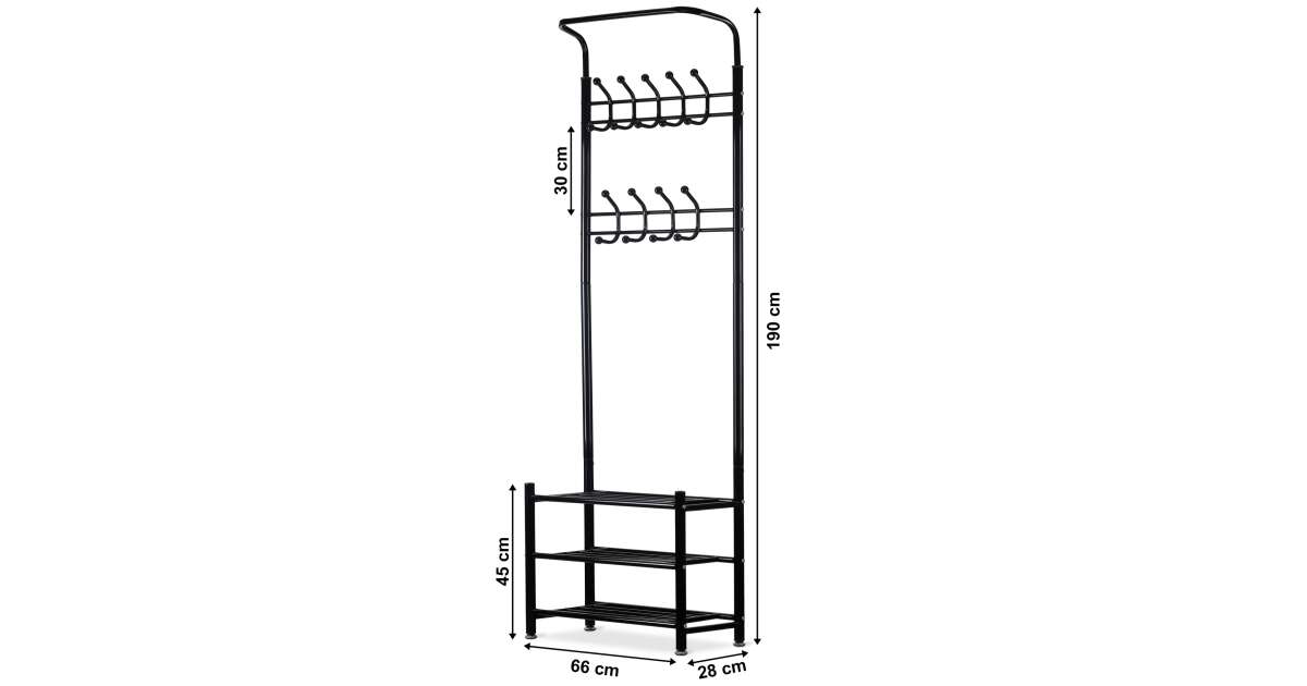 -Veľký pevný predsieňový stojan na oblečenie a topánky, 190 x 66 x 28 cm, čierny popis