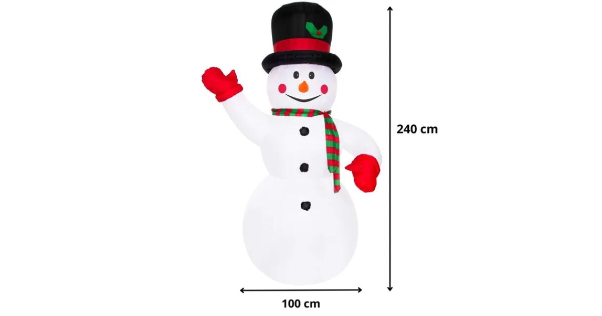Tento 240 cm vysoký, nafukovací snehuliak bude perfektným doplnkom vašej vianočnej výzdoby. Vytvorí veselú, sviatočnú atmosféru v záhrade alebo pred domom. Zabudované LED osvetlenie vyžaruje magické svetlo a dodá večerom výnimočnú atmosféru.