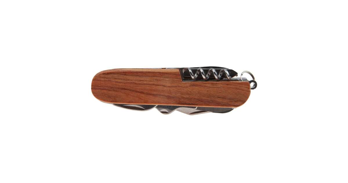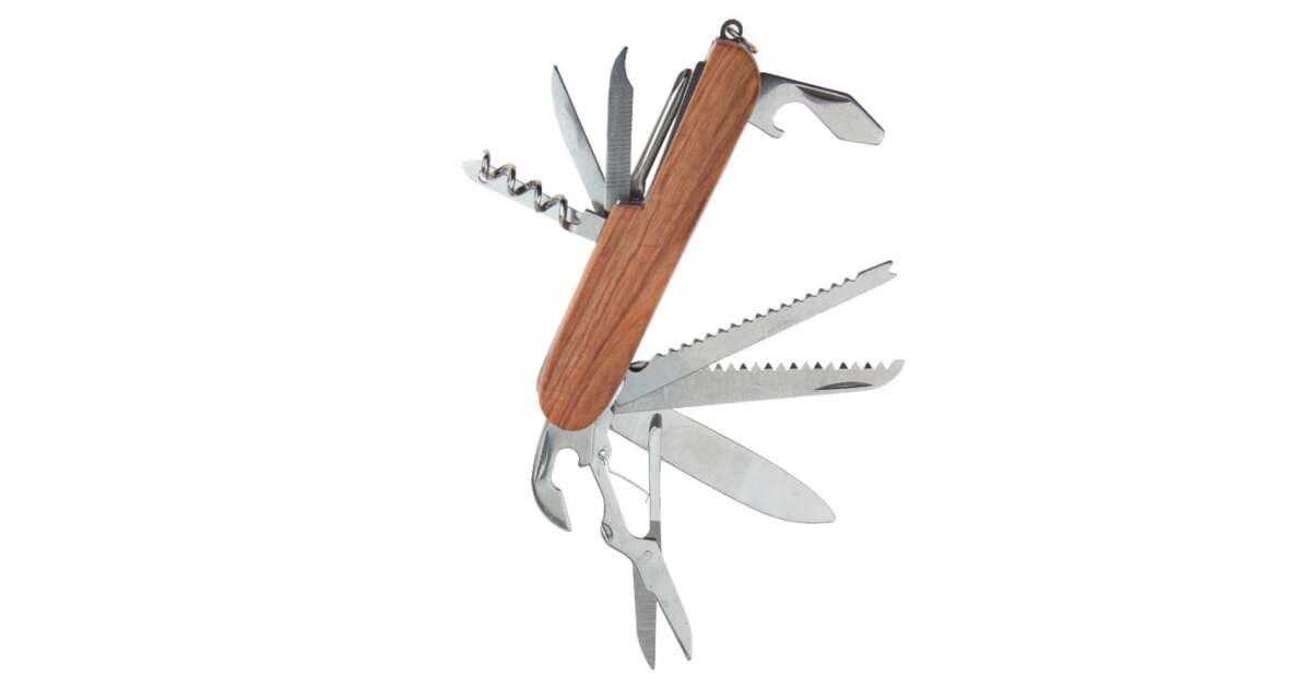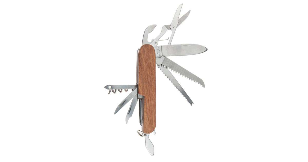 Multifunkčný vreckový nôž IdeallStore® z nehrdzavejúcej ocele s drevenou rukoväťou, 14 funkcií popis