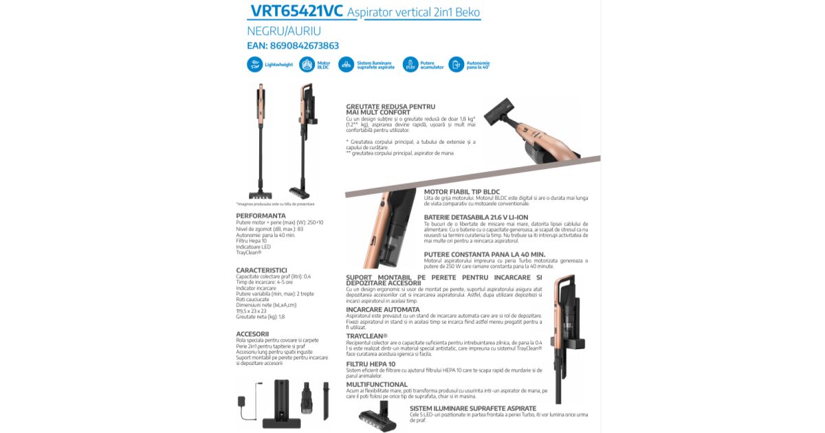 2v1 zvislý vysávač BEKO VRT65421VC, 250W, 0,4l, maximálna výdrž 40 min, LED svetlo, HEPA 10 filter, TrayClean, čierno-zlatý popis