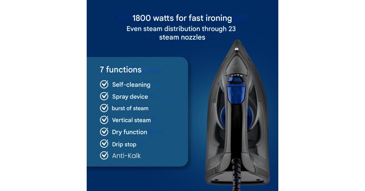 - 7 funkcií: Sprej, para, vertikálna para, suché žehlenie, samočistiaca funkcia, kvapková funkcia