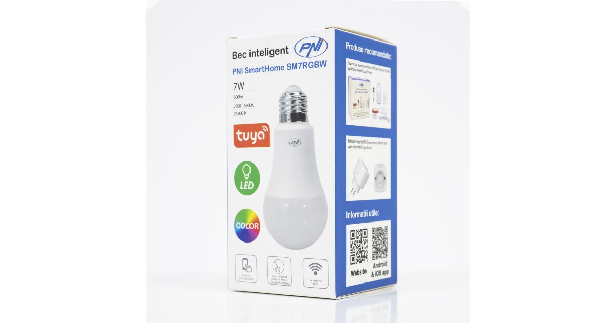 PNI SmartHome SM7RGBW je inteligentná LED žiarovka, s ktorou môžete ovládať jas, teplotu farieb a farby zo svojho smartfónu alebo pomocou hlasového ovládania. Je kompatibilná so systémami Alexa a Google Home, takže ju môžete jednoducho integrovať do inteligentného systému vášho domova.
